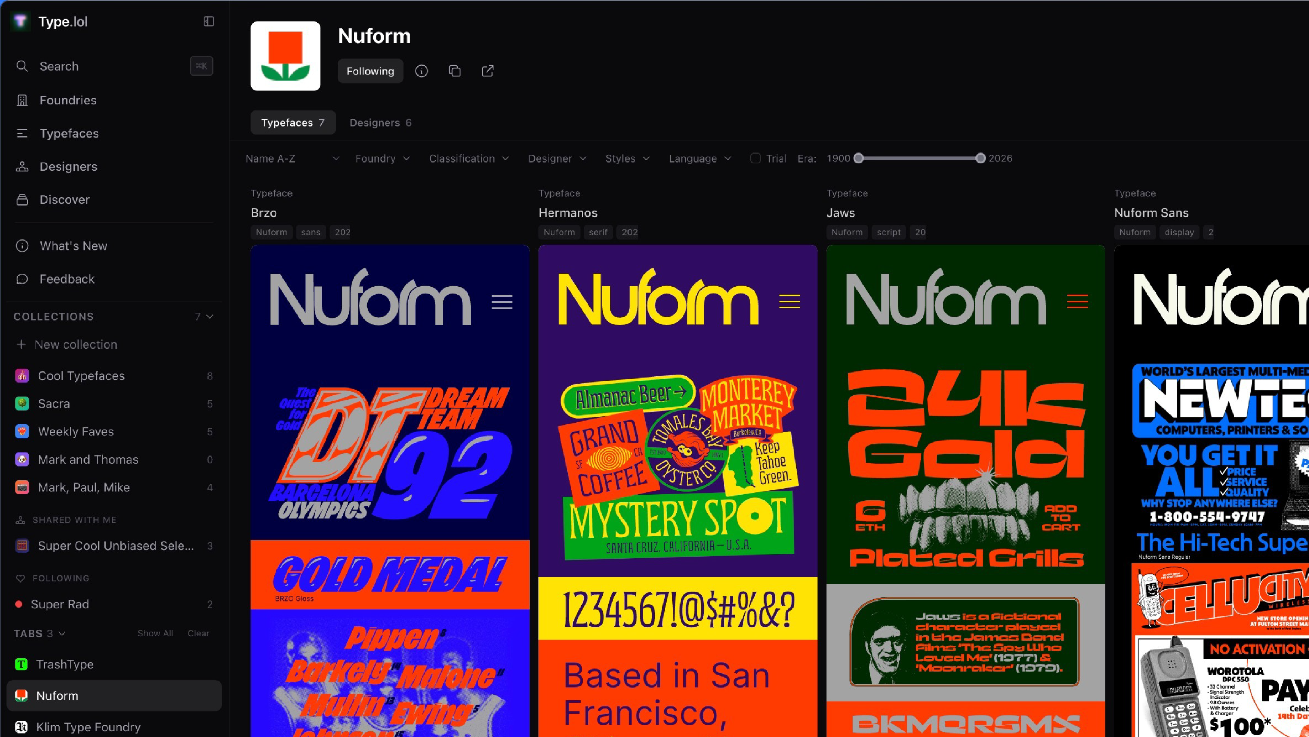 Mark describes Type.lol as “Spotify for Fonts” and once you spend some time with it, that comparison makes sense. This isn’t just a list of foundries with links, it’s a discovery platform that allows you to make your own playlists.
